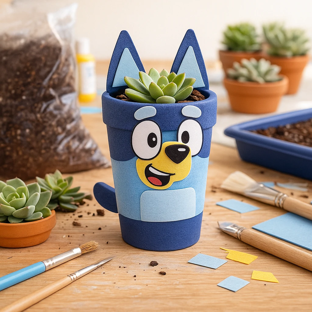 This DIY project is not only fun but also functional. The end result is a lively Bluey-faced planter perfect for small succulents or herbs. It’s a great way to introduce young ones to simple gardening while letting them express their artistic side. The tactile nature of cutting, gluing, and painting also helps develop fine motor skills—making it a perfect craft for home or classroom.