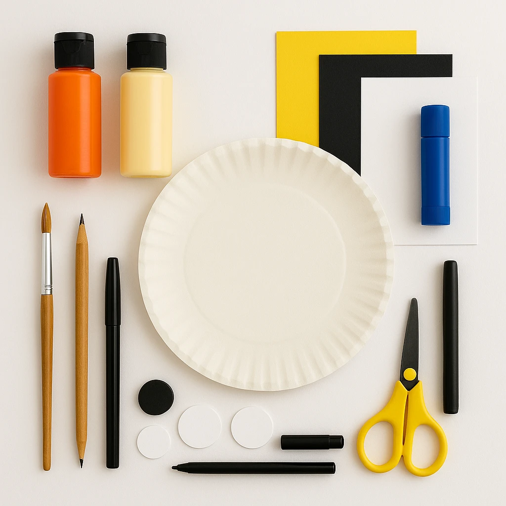 - Step 1: Paint the Paper Plate Base – Flip the plate over and paint the top two-thirds orange and the bottom third cream or light yellow. Let it dry completely.