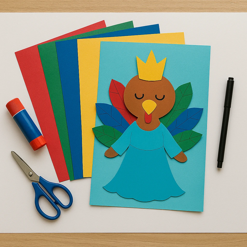 Cut a tall, regal crown shape from bright yellow or gold paper. You can keep it simple or add gem shapes for extra flair. Attach the crown to the top of the turkey's head, tilting it slightly for personality.