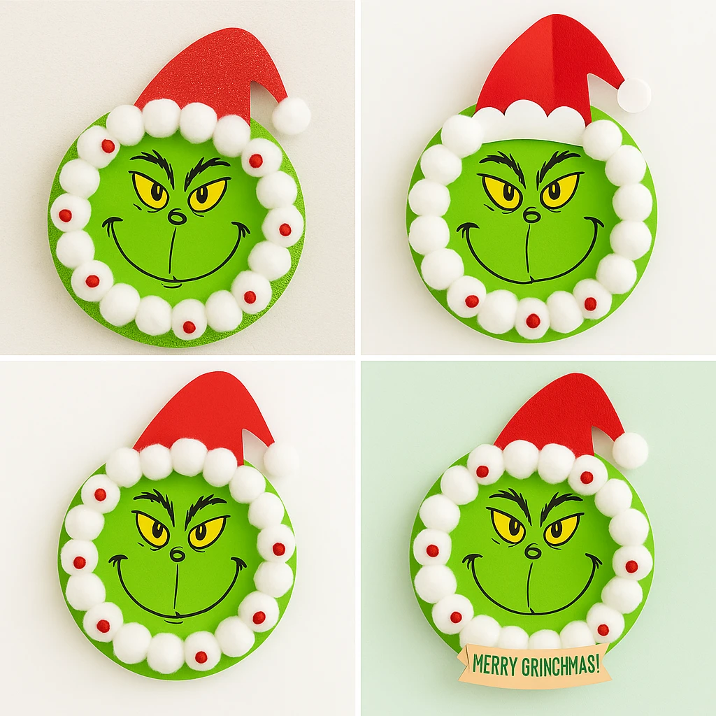 Let younger kids use a printable Grinch face template to simplify the craft. Add glitter, 3D elements, or a holiday quote to personalize the wreath. Allow glue to dry fully before hanging.