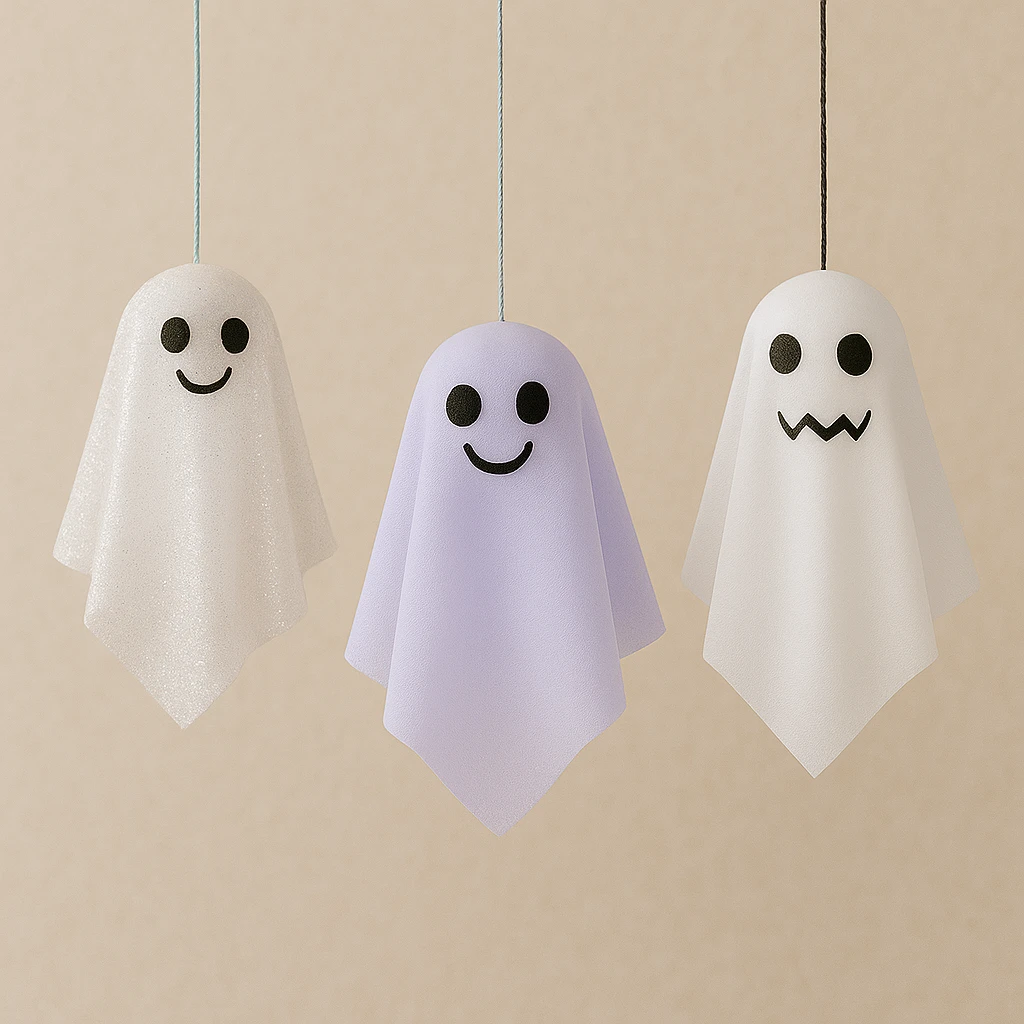 2. Colorful Ghosts – Instead of white, use pastel-colored fabric or even glow-in-the-dark fabric for a playful twist. Neon ghosts work well for parties and can even match themed color palettes.