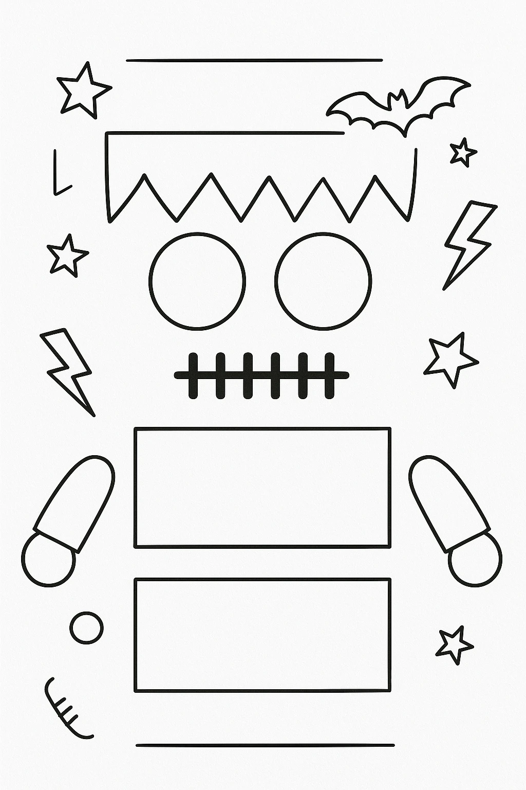 To make this craft even easier, you can use a printable Frankenstein template. The downloadable page includes the hair, eyes, mouth, and shirt elements, all ready to be colored and cut out. Simply print the sheet on cardstock or regular paper, let the kids color in the elements, and then glue them onto the painted toilet roll.