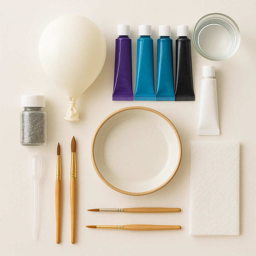 Inflate the balloon to medium size (about 6–8 inches in diameter), then tie it securely. Place the tied end into a shallow dish or cup so the balloon stands upright. Make sure your workspace is covered with newspaper or paper towels to catch paint drips.