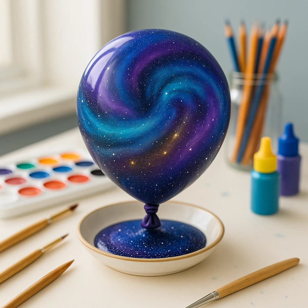 Carefully move the balloon (still in its dish) to a safe drying area. Let it sit undisturbed for at least 3–4 hours, or overnight for best results. As it dries, the paint will continue to shift slightly, enhancing the galactic look.
