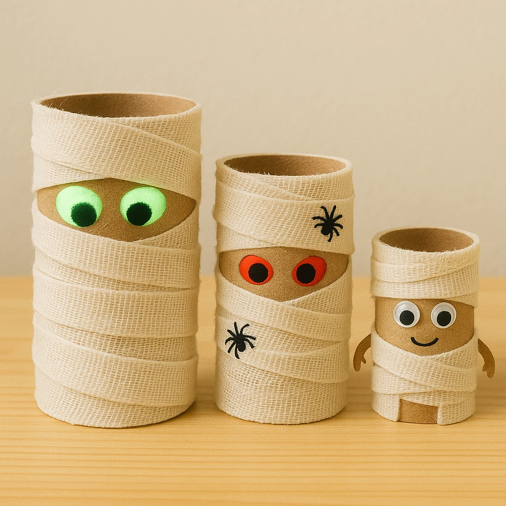 Mini Mummy Family: Use cardboard tubes of varying sizes—like paper towel rolls cut in half—to make a whole family of mummies. Each one can have a different eye shape or facial expression.