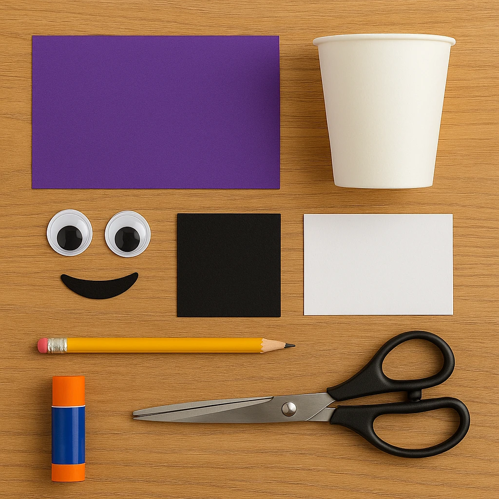 Start by cutting a piece of purple cardstock that fits around your cup. Most standard paper cups need a strip around 9 inches long by 4 inches tall. Apply glue or double-sided tape to the back of the paper and wrap it snugly around the cup. Trim any excess for a clean fit.