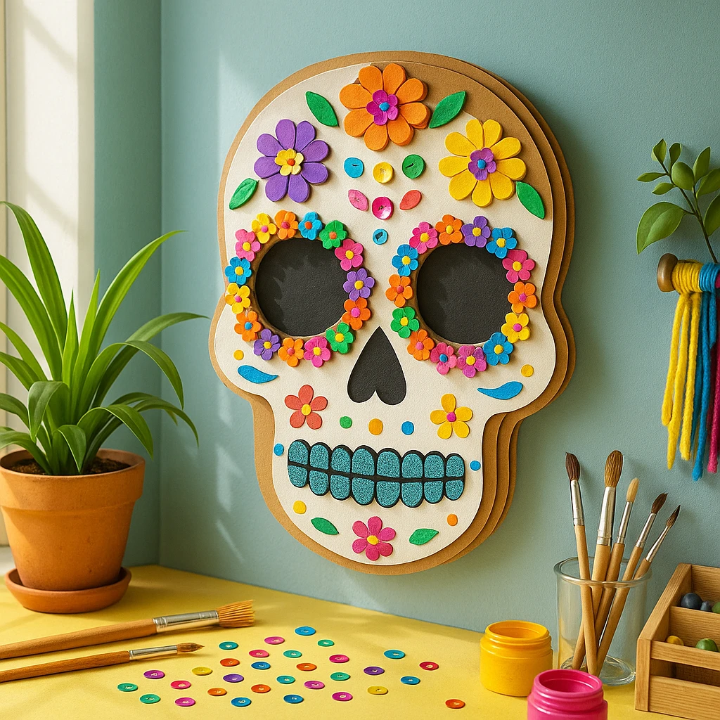 Celebrate cultural heritage with a bold and creative craft that brings color, meaning, and fun into your home or classroom. This Vibrant 3D Floral Sugar Skull Wall Decor project is inspired by the beautiful traditions of Dia de los Muertos. With its layered cardboard base and brightly colored floral decorations, this project transforms a classic symbol into a vivid piece of DIY wall art.